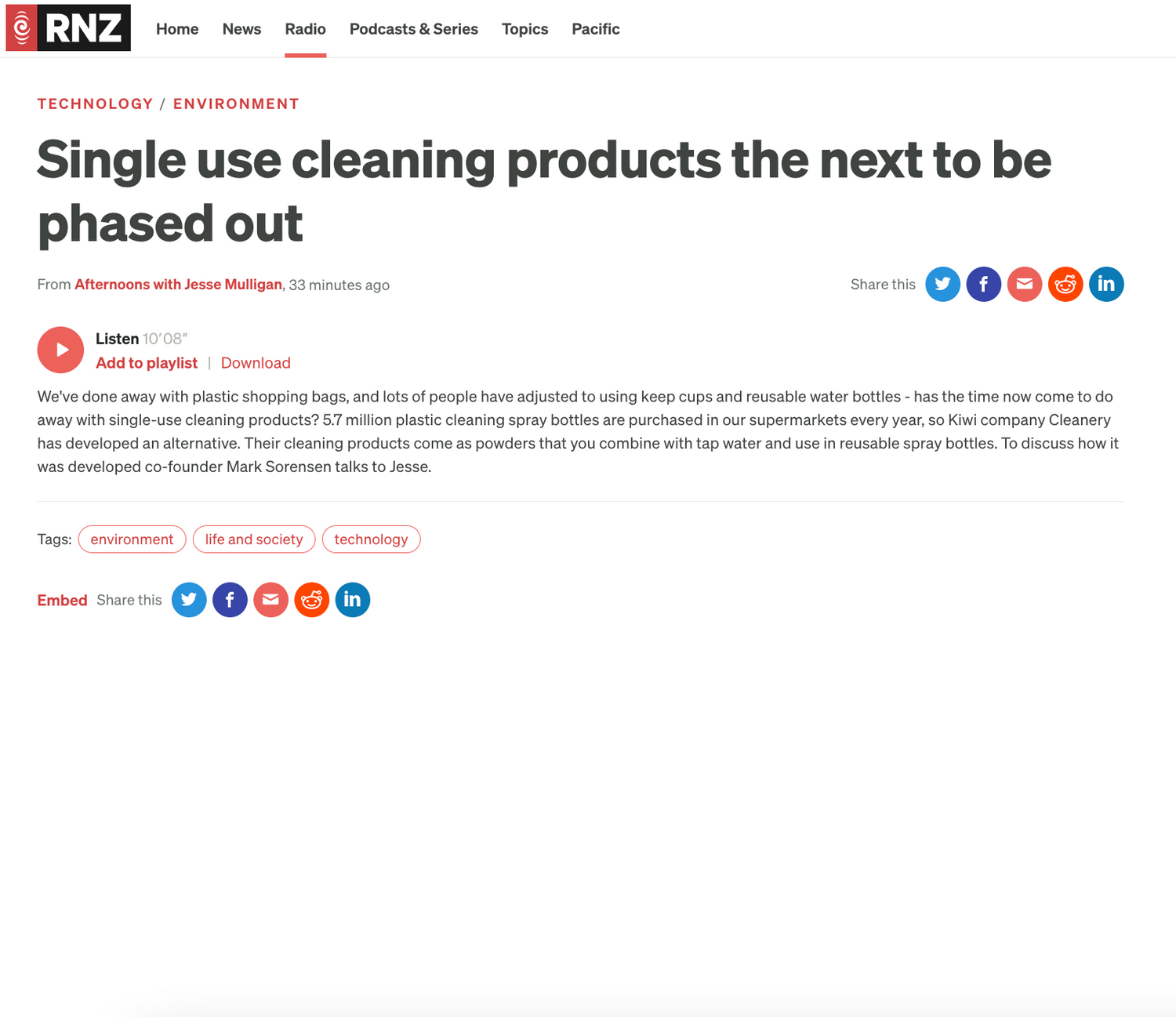 Mark Sorensen chats with Jesse Mulligan on Radio New Zealand about how Cleanery is tackling the problem of single use cleaning bottles, by creating an eco product that actually works