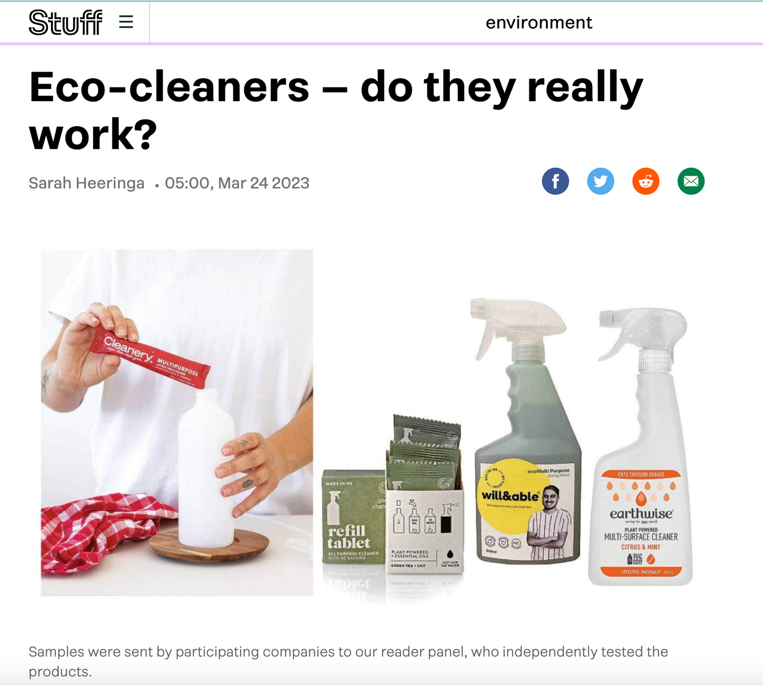 Stuff.co.nz's independent testing panel put four eco cleaners through their places. Cleanery came out firmly on top, scoring 95% for cleaning performance and with 95% of testers saying they would buy it again.